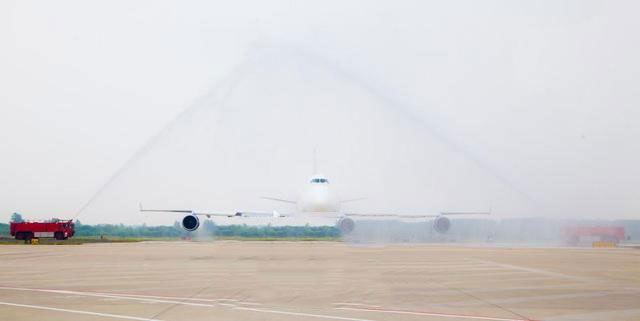 2018年5月18日,由韓國仁川至江蘇無錫再至德國哈恩的5Y523/524航班緩緩落地,通過“水門”迎接。